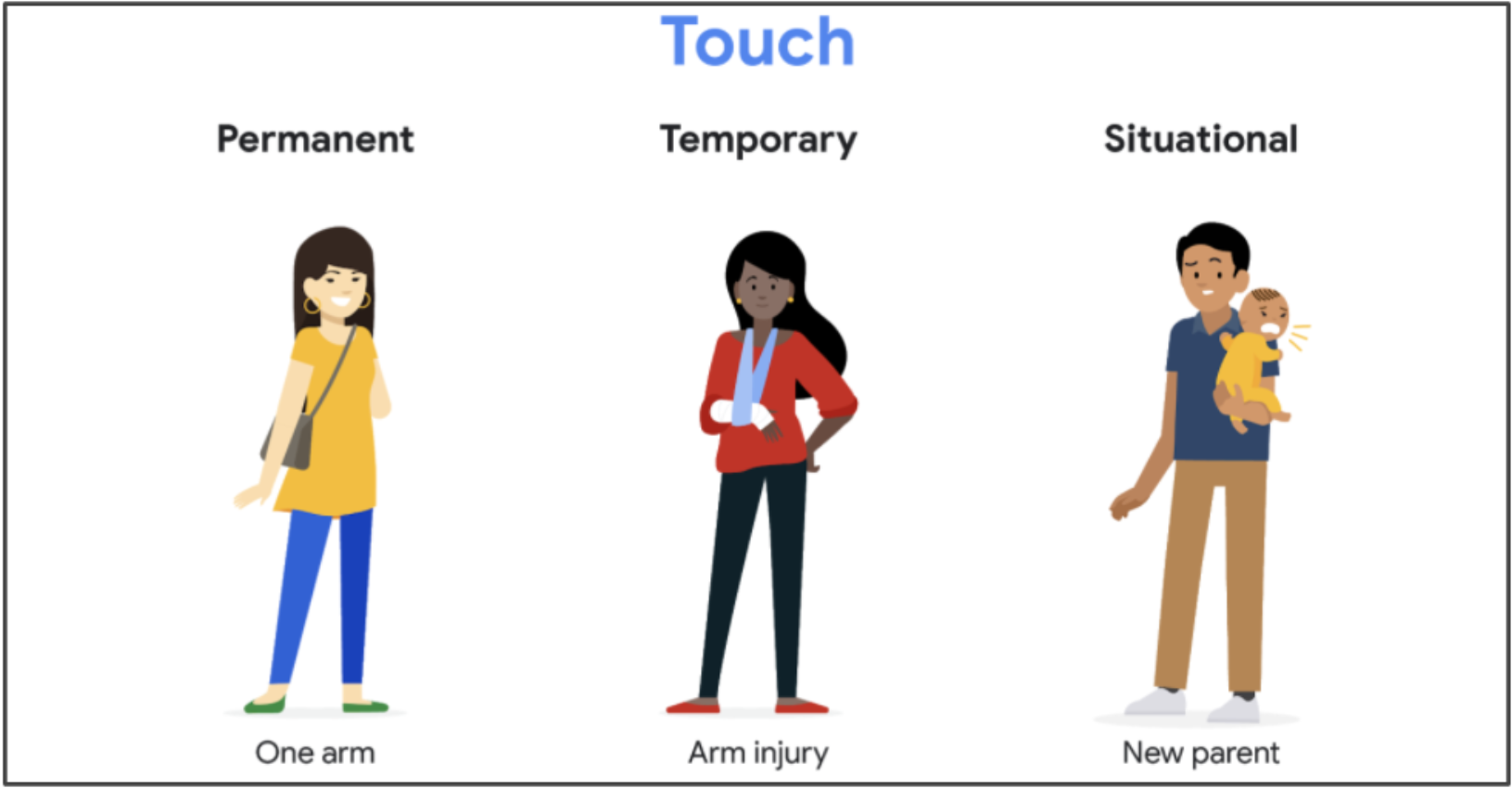 There are 3 types of disabilities — permanent, temporary, and situational. For example, when a person who has had an injury in their arm is left with permanent damage, and they are unable to function with this arm — this is a permanent disability. A person who has fractured their arm and is waiting for it to heal, is suffering from a temporary disability. However, someone whose situation makes them disabled, for example a mother holding a baby in one arm is suffering from situtation disability. She is unable to use on of her arms in all situations.
