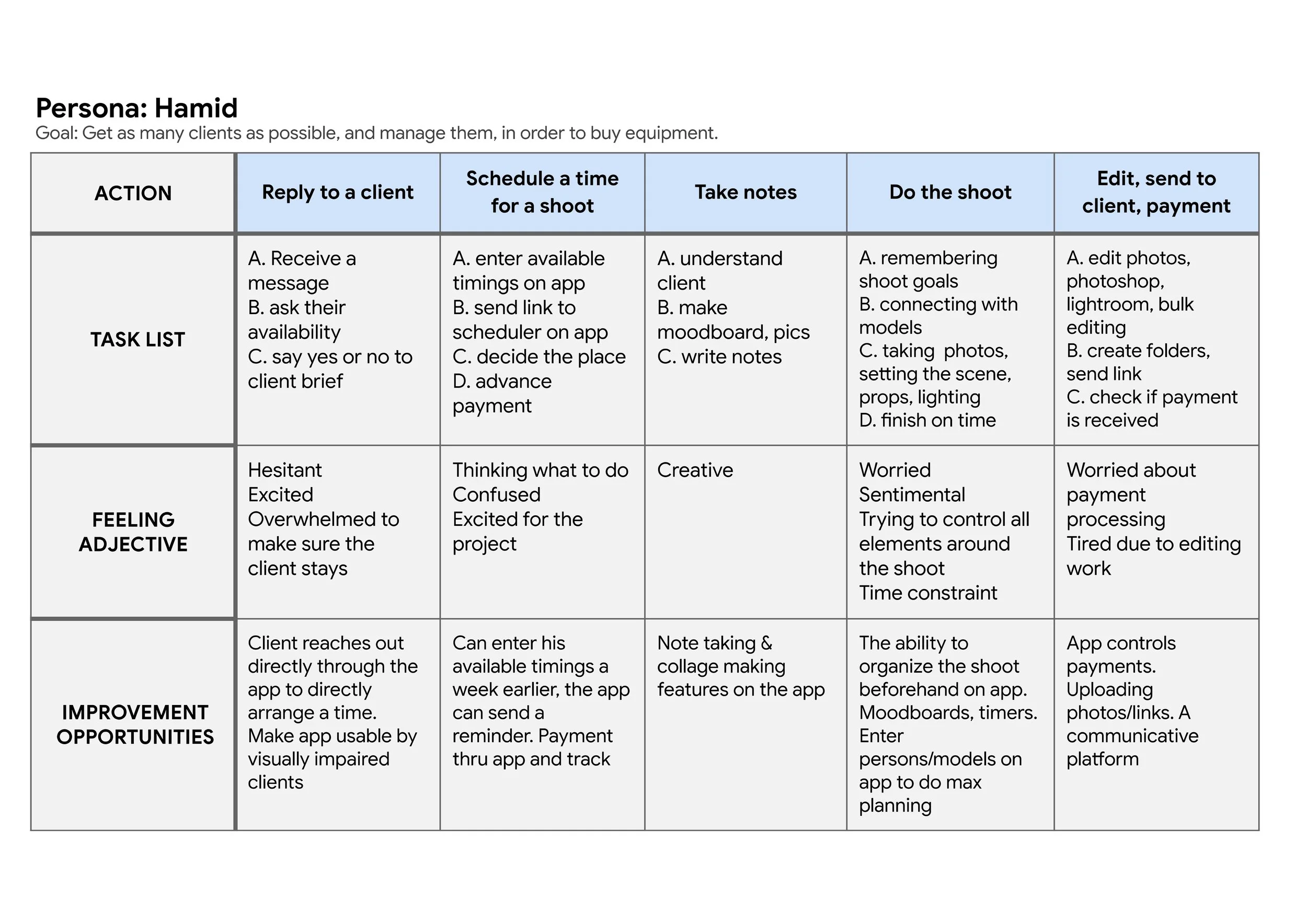 I created a user journey map of one of my personas, Hamid. It shows different actions he takes, such as “reply to a client”, and how he feels at every moment in those actions. The journey map takes us through different feelings and tasks of his experience when booking an appointment, doing the photoshoot, editing photos, and receiving payment.