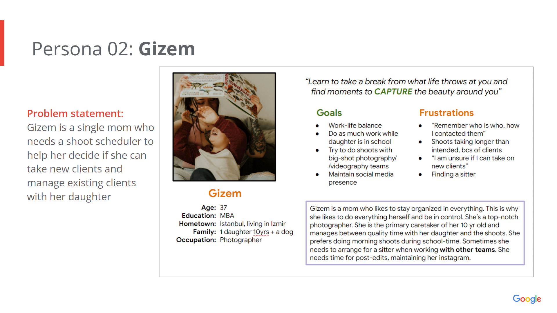 In my case, since I could only carry out interviews of 2 participants, I used the remaining information from 2 of my personas, Hamid and Gizem (see wiki fig. 1.3, 1.4) . Once again, it is important to remember here to choose personas with diverse demographics , abilities, and backrgounds so that we can address the issue of accessibility. In this case I used a single mom (Gizem) who works with a team, and a student (Hamid) who works as a solo photographer. Both have different aims in life and in careers, and having these personas helped me make more user cases for my project “Capture”.
