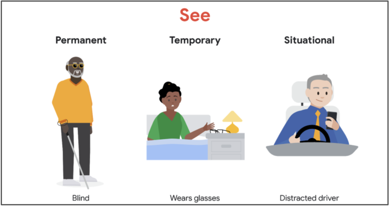 So when designers create designs for people with permanent diabilities, they’re also empowering those with situational or temporary diabilities.