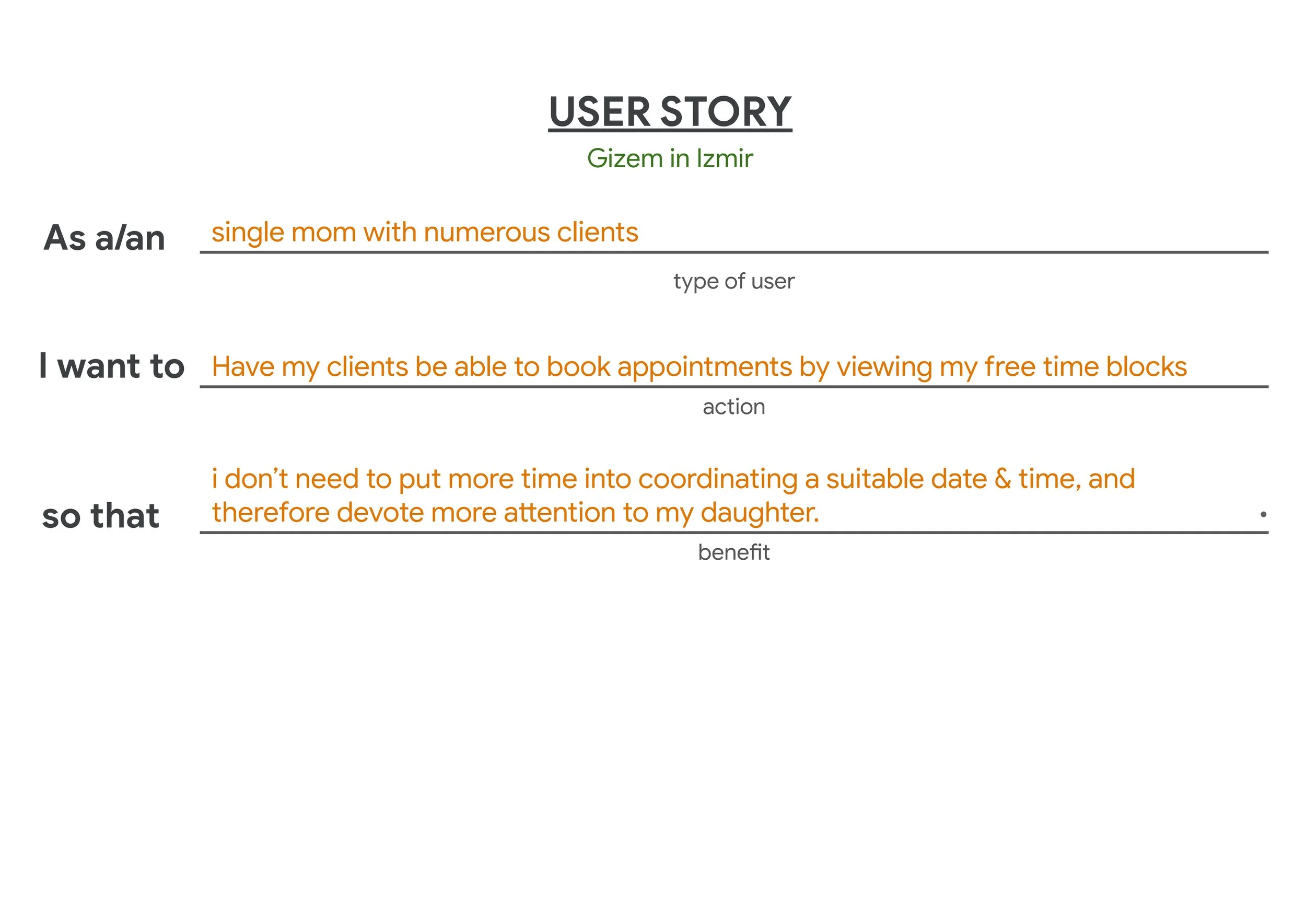 User Story of gizem. This lets us know her context (where she is standing) and what her main problem is (problem statement) to carry out a specific task (action)